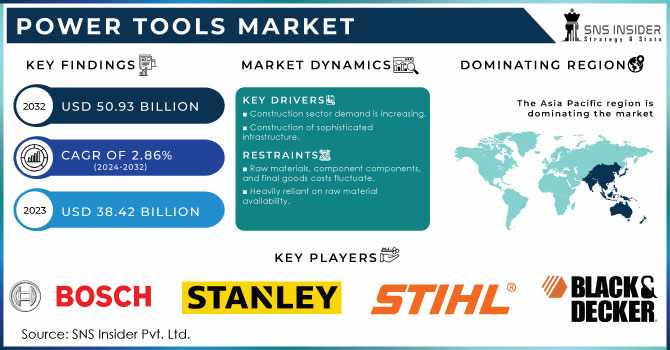 The Power Tools Market size was valued at USD 38.42 Billion in 2023 and is expected to reach USD 50.93 Billion by 2032 and grow at a CAGR of 2.86 % over the forecast period 2024-2032.